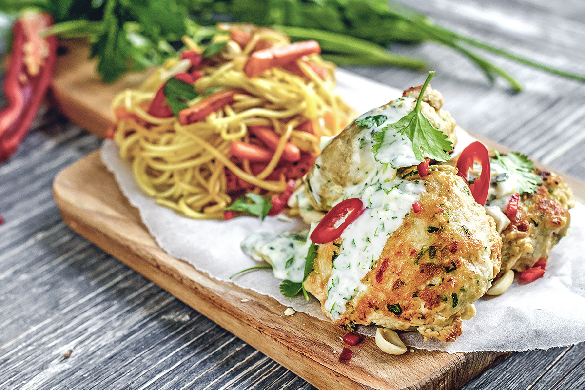 Шаг 4: Для соуса мелко порубите оставшуюся кинзу, выжмите сок из одной половинки лайма, натрите цедру. Соедините в миске цедру, кинзу и йогурт, посолите и перемешайте. Подавайте фишкейки с лапшой, полив соусом. Приятного аппетита!