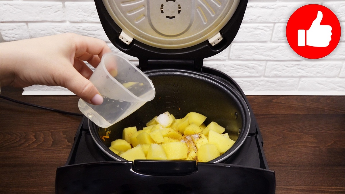 2. После жарки выключить режим "жарка" и добавить картофель, соль, перцы и горячую воду. Не перемешивать. Готовить на режиме "тушение" или "мультиповар" при температуре 110°C в течение 1 часа.
