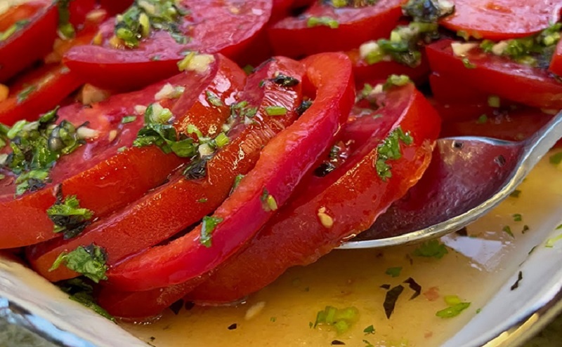 Главный секрет вкусного салата заключается в гармонии текстур и вкусов. Пряный соус с базиликом, чесноком и уксусом не просто подчеркивает вкус помидоров, но и придает им особую насыщенность, создавая эффект маринованных овощей, сохраняя их свежесть. Этот салат можно подавать как отдельное блюдо, гарнир к мясу или как легкий ужин с хрустящим хлебом.