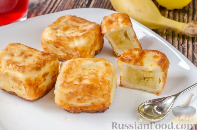 Необычные сырники-кубики с банановой начинкой придутся по душе всем. Кроме оригинальной формы, внутри вас ждет кусочек сладкого банана, который придаёт этому завтраку особенный вкус и аромат.