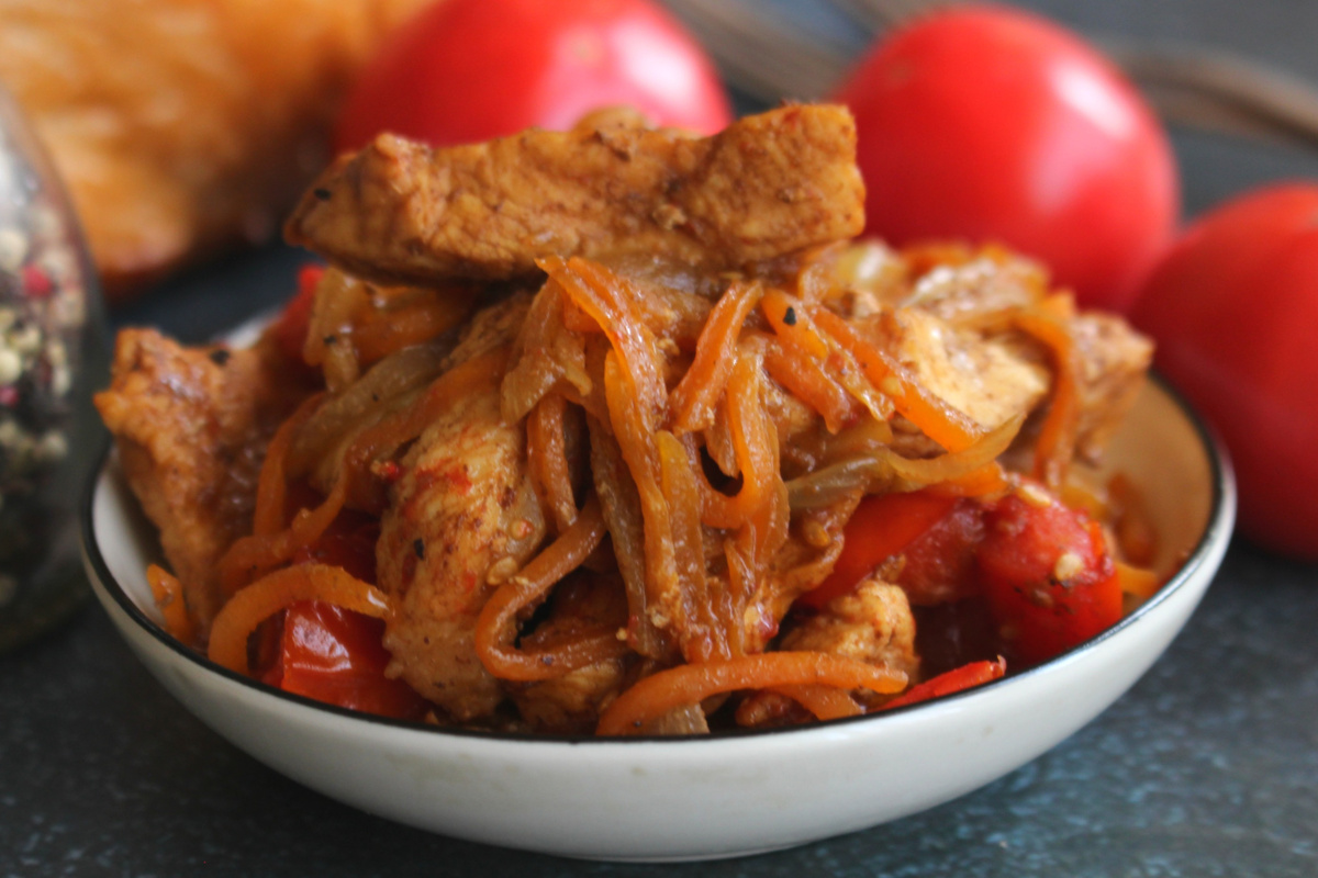 Овощи следует обжаривать около двух минут на среднем огне, постоянно помешивая. Затем нарезанную длинными брусочками куриную грудку добавляют в сковороду и обжаривают всё вместе ещё четыре минуты. После этого, нарезанные дольками помидоры выкладываются к мясу.