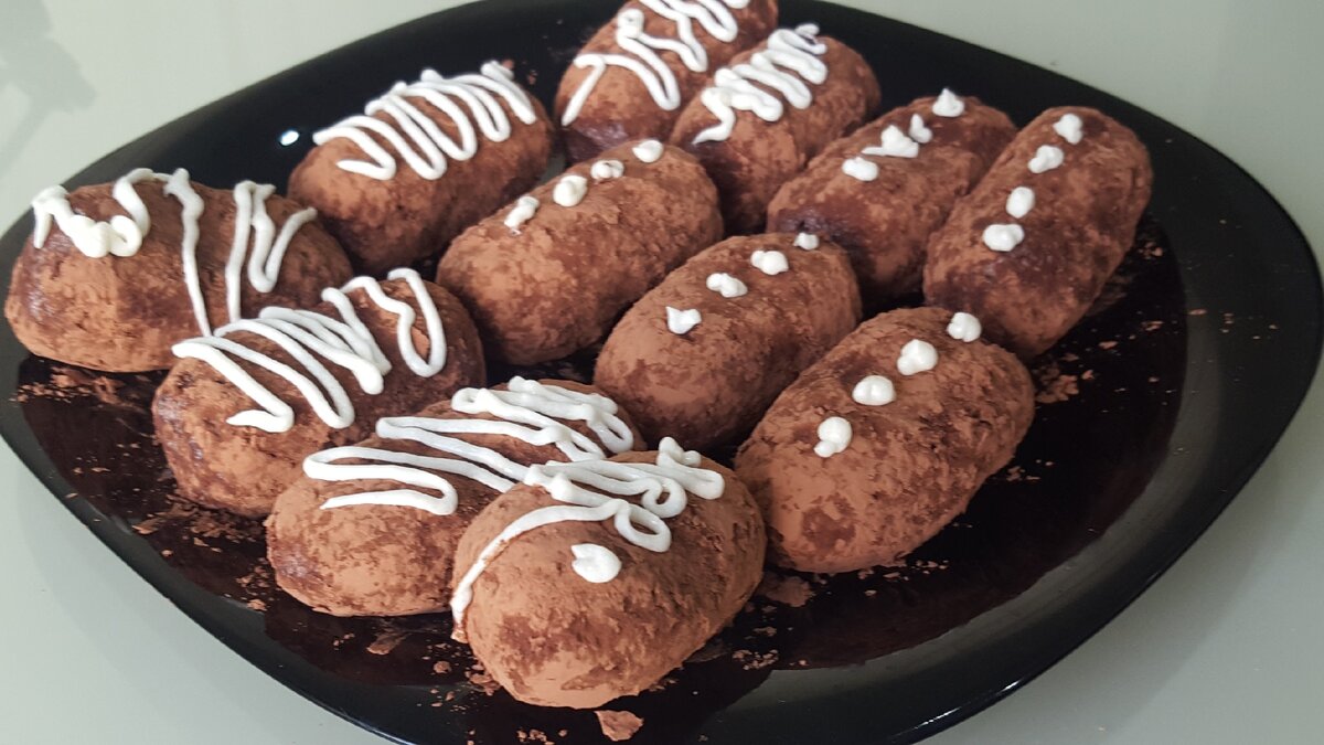 Пришло время формировать пирожные в виде клубней. Заготовки обваляли в какао и украсили оставшимся кремом, после чего отправили в холодильник на три часа, а лучше — на пять или шесть для достижения лучшего вкуса.