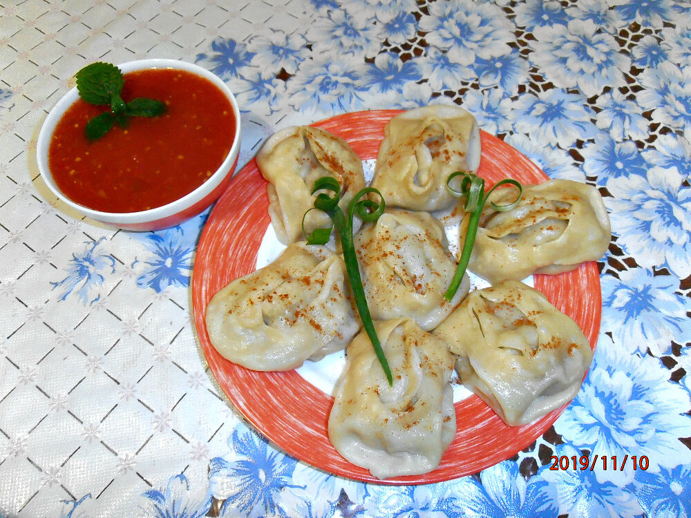 По истечении времени манты будут готовы — их аромат раскроется по всей кухне и соберет всех за столом. Подавайте манты горячими, посыпав красным перцом и добавив немного густого томатного сока. Эти манты получатся однозначно вкусными и сочными — пробуйте!