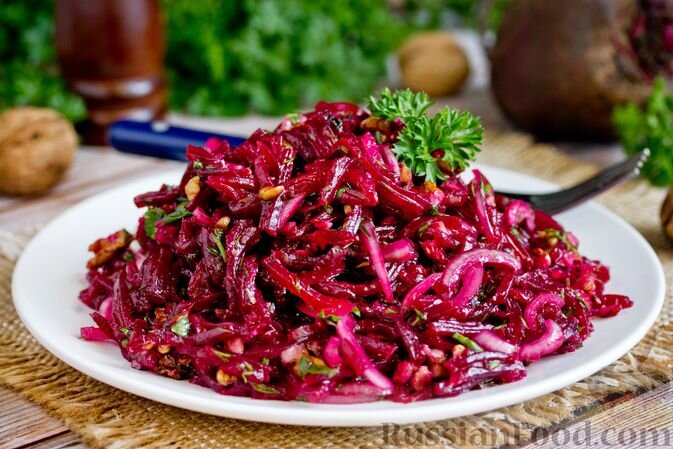 - Салат с орехами и луком: Сочетание отварной свёклы, хрустящего репчатого лука и грецких орехов создаёт неповторимый контраст. Ароматная заправка из чеснока, зелени и яблочного уксуса придаёт яркости и насыщенности этому блюду.