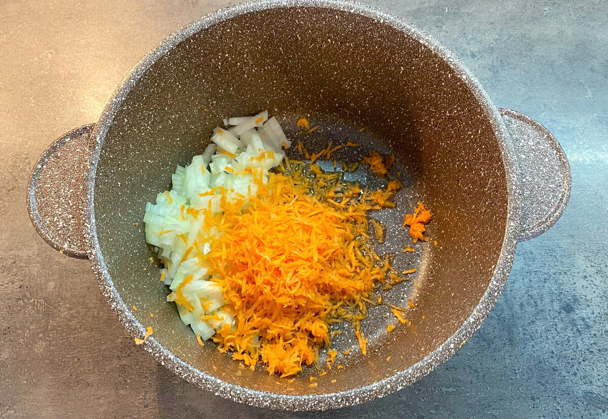 - В глубокую кастрюлю с толстым дном налить растительное масло и обжарить лук с морковью на среднем огне до золотистой корочки, перемешивая при этом.