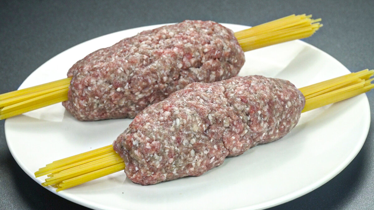3. Разделите фарш на две равные части. Из одной части сформируйте плоскую лепешку, в центр которой положите 50 г спагетти. Это важный момент — соблюдение пропорций гарантирует, что спагетти не останутся сырыми.