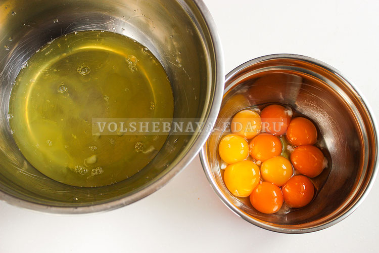 Добавляйте сахар и ванильный сахар небольшими порциями, продолжая взбивать до получения мягких пиков. Затем по одному вводите желтки, не прекращая взбивать массу.