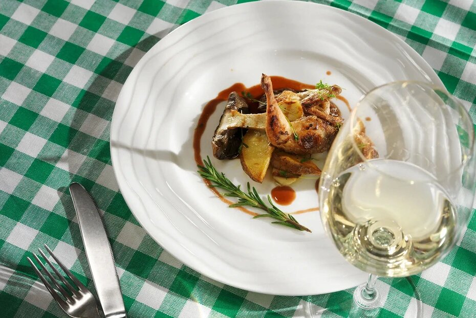 Для соуса чернослив помещается в сотейник и заливается вином, после чего добавляется 50 мл воды и сахар. Легко посолив, доводим до кипения и варим на среднем огне около двадцати минут. Полученный соус процеживается через сито, а для загустения добавляется крахмал.Белые грибы нарезаются крупными кусками, а мясо перепелок отделяется от костей, оставляя ноги целыми. Птицу нужно разрезать на четыре части.Картофель отваривается в течение пяти минут и затем нарезается на дольки.Дольки картофеля и перепелку обжаривают на оливковом масле с добавлением розмарина, чеснока и шалфея до золотистой корочки. После переворота перепелки на другую сторону в сковороду добавляются белые грибы. Не забудьте посолить и поперчить по вкусу.После готовности подавайте перепелку с картофелем на тарелках и полейте соусом.Данное блюдо станет изюминкой любого ужина, не оставляя равнодушным ни одного гостя!