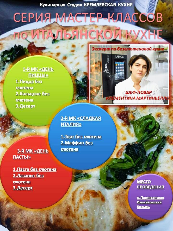 В конце ноября кулинарная студия "Кремлевская Кухня" приглашает на серию уникальных мастер-классов с участием шеф-повара и кондитера Клементины Мартиньело из Беневенто (Италия) и шеф-повара Олега Ольхова. Главная тема мероприятий — классическая итальянская кухня без глютена, в приготовлении которого будут использованы удивительные смеси на основе амарантовой муки.