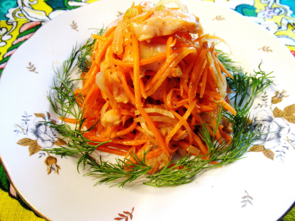 На выходе получается яркий остро-кисло-соленый салат с сладковатой ноткой, где хрустящая морковь сочетается с нежным мясом и выразительным чесноком. Хе не только сохраняет свои свойства в холодильнике, но и продолжает радовать вкусом даже на следующий день. Этот салат стал обязательным пунктом новогоднего меню многих семейств, и без него Новый год уже не кажется полным.