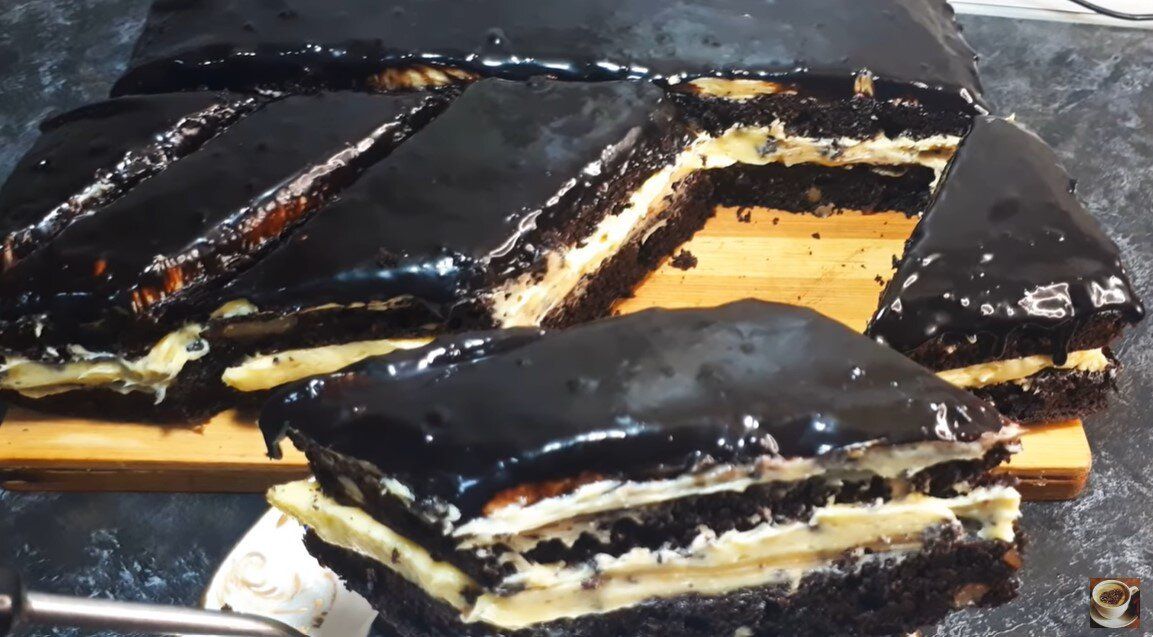 После того как коржи охладятся, их следует разрезать, если вы испекли один большой корж. На первый корж наносится крем и снова укрывается вторым. После этого аккуратно полейте торт горячей глазурью и оставьте его на один час для пропитки.