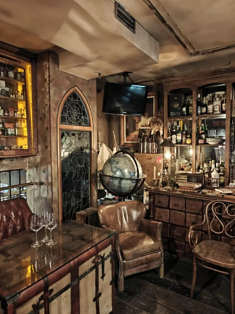 Дизайнеры Pharmacie вложили душу в создание уникального интерьера, наполненного винтажными артефактами. Здесь можно увидеть не только красивую мебель, но и удивительные витражи, полы и даже двери, которые придают заведению особый шарм. Мягкое, тусклое освещение, напоминающее свечное, делает атмосферу практически магической, а детали интерьера можно изучать бесконечно, толкаясь плечом к плечу с другими посетителями, которые, как и вы, пришли насладиться временем и вкусом.