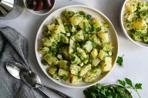 Этот салат идеально гармонирует с шашлыками и подается теплым. Вот его простой ингредиентный набор: