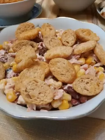 5. Тщательно перемешайте все компоненты, заправьте майонезом и аккуратно посыпьте сухариками перед подачей.