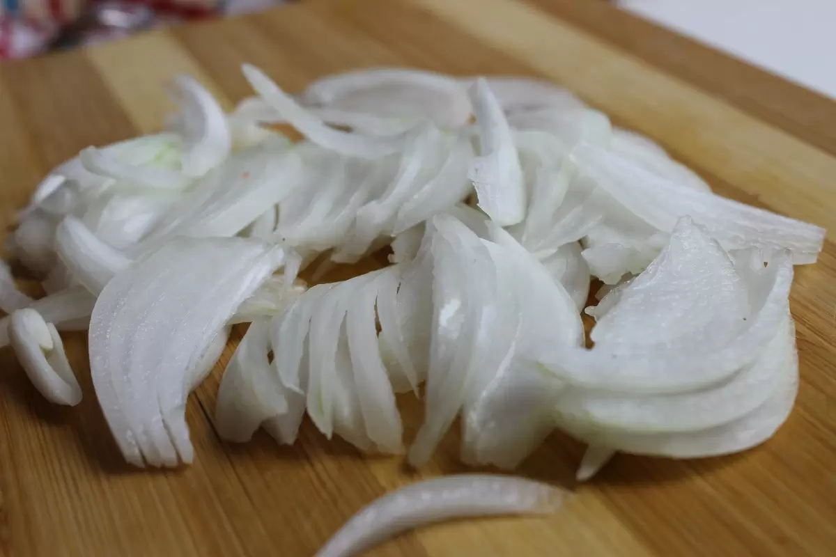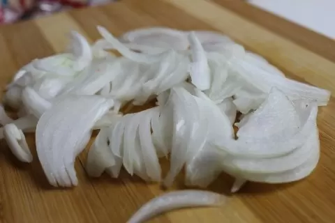 1. Поставьте кастрюлю с толстым дном на огонь. Нарежьте лук полукольцами, а морковь — соломкой. Обжарьте лук с морковью в горячем масле до мягкости.