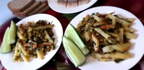 Готовую картошку с горошком лучше всего подавать с малосольной селедкой, ржаным хлебом и свежими огурцами. Это классическое сочетание не оставит никого равнодушным.