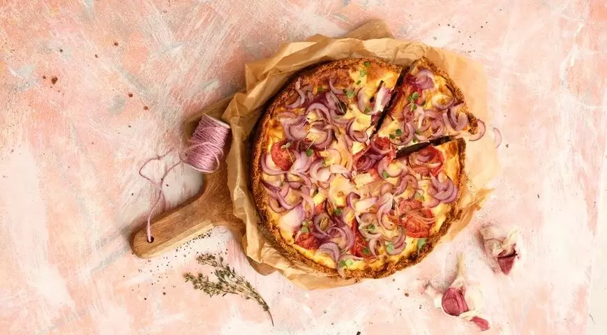 В отличие от традиционных рецептов, тесто здесь отсутствует. Основу пирога формируют раскрошенные крекеры, которые смешиваются с яйцами — просто и оригинально. Однако основная изюминка блюда кроется в начинке: нежная сырная масса в сочетании с запеченными помидорами создает невероятный вкус и текстуру.
