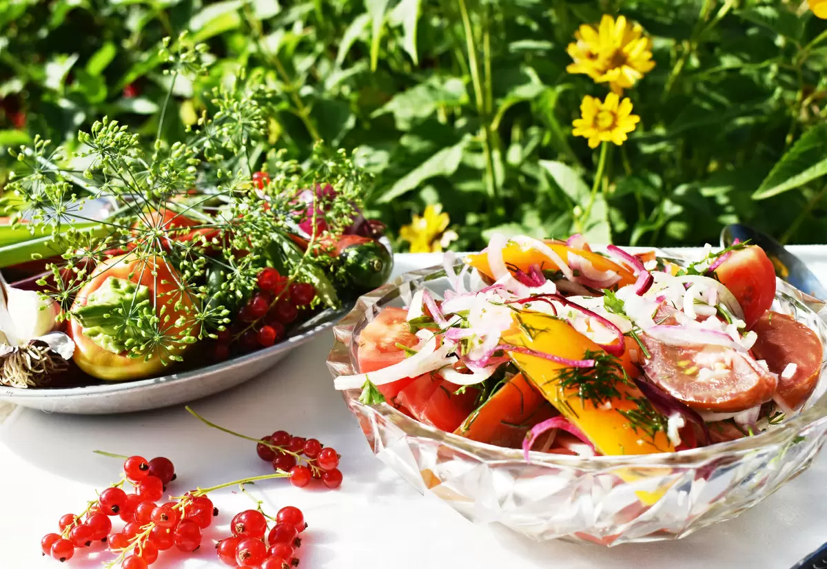 Летний салат из помидоров уже готов и ждет своего звездного часа на вашем столе. Это простое, но изысканное блюдо станет не только замечательным гарниром к шашлыкам, но и ярким акцентом на любом пикнике. Приятного аппетита!