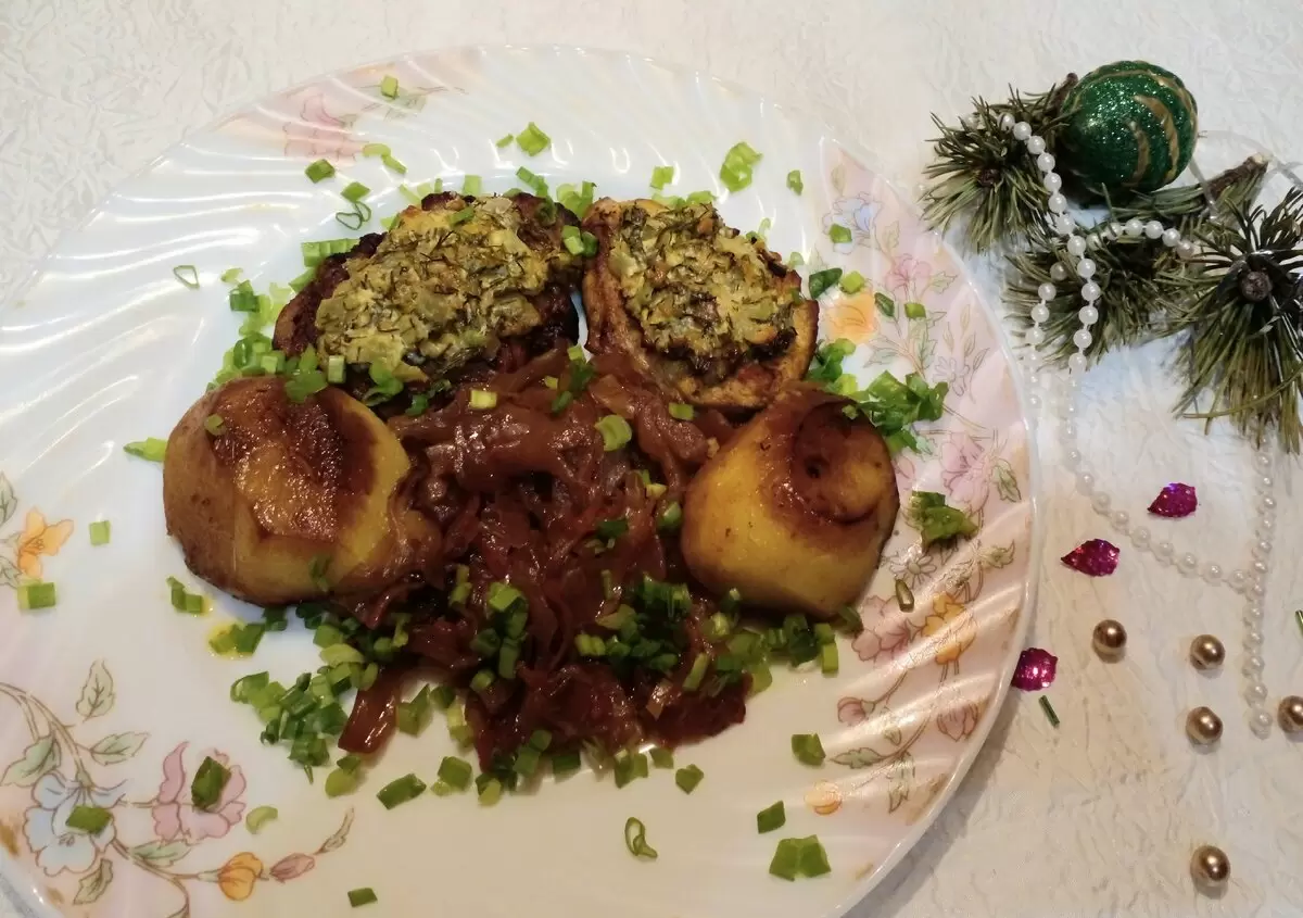 Подача готового блюда с тушеными овощами и запеченной картошкой добавит элемент домашнего уюта на столе. Приятного аппетита!