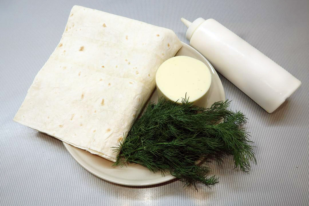 На чистой поверхности раскладываем лист лаваша и разрезаем его на две части. На каждую часть наносим немного майонеза, после чего выкладываем две столовые ложки начинки.