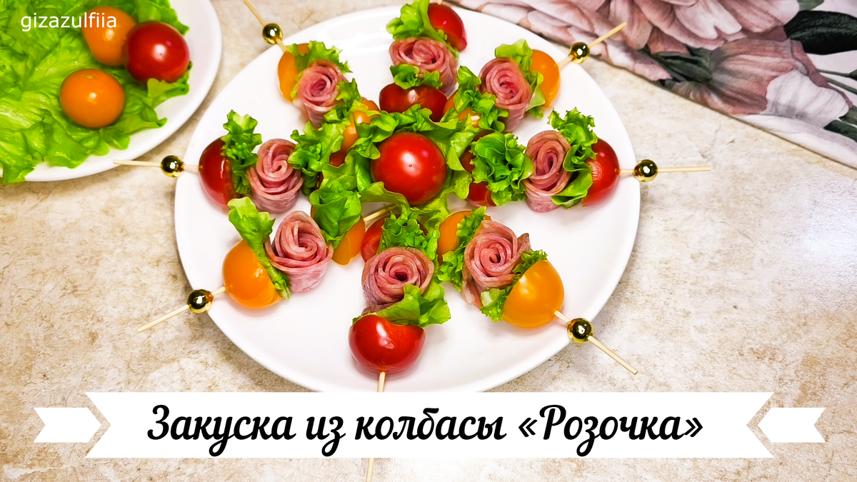 Чтобы создать одну «розочку», потребуется выложить три кружочка колбасы в ряд, слегка перекрывая их друг другом. Затем этот ряд стоит аккуратно сложить пополам и свернуть в форме рулета, чтобы в результате получилась изящная «розочка». Далее, на шпажку аккуратно насаживаются ингредиенты в следующем порядке: половинка помидора черри, лист салата, готовая колбасная «розочка», снова листик салата и, завершая, вторая половинка помидора черри.