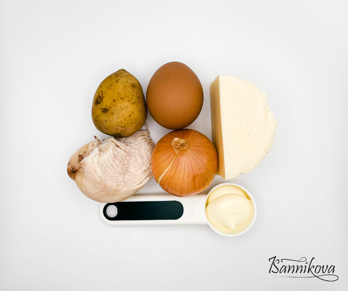 Следующий этап — подготовка основных ингредиентов: куриное филе можно нарезать кубиками или порвать на волокна, а сыр, картофель и яйца натереть на крупной терке. Этим шагом вы создадите идеальную текстуру для слоев салата.