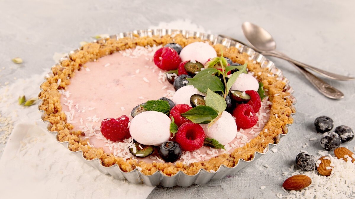 Охладить пирог перед подачей. Подавайте порционно, украсив свежими ягодами и мятой по желанию.