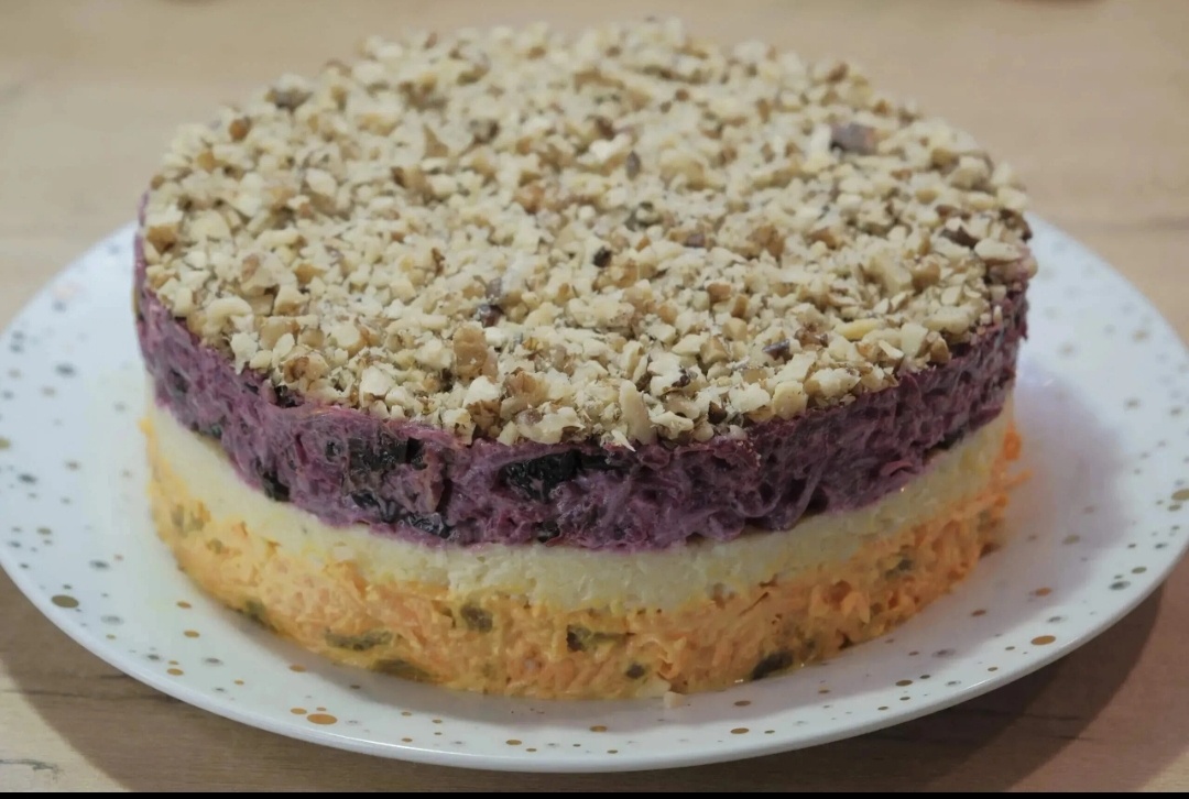 4. Обильно посыпьте сверху рублеными грецкими орехами и уберите в холодильник на 20-30 минут. Соль не требуется, так как её достаточно в сыре и майонезе, чтобы сохранить сладость изюма и чернослива.