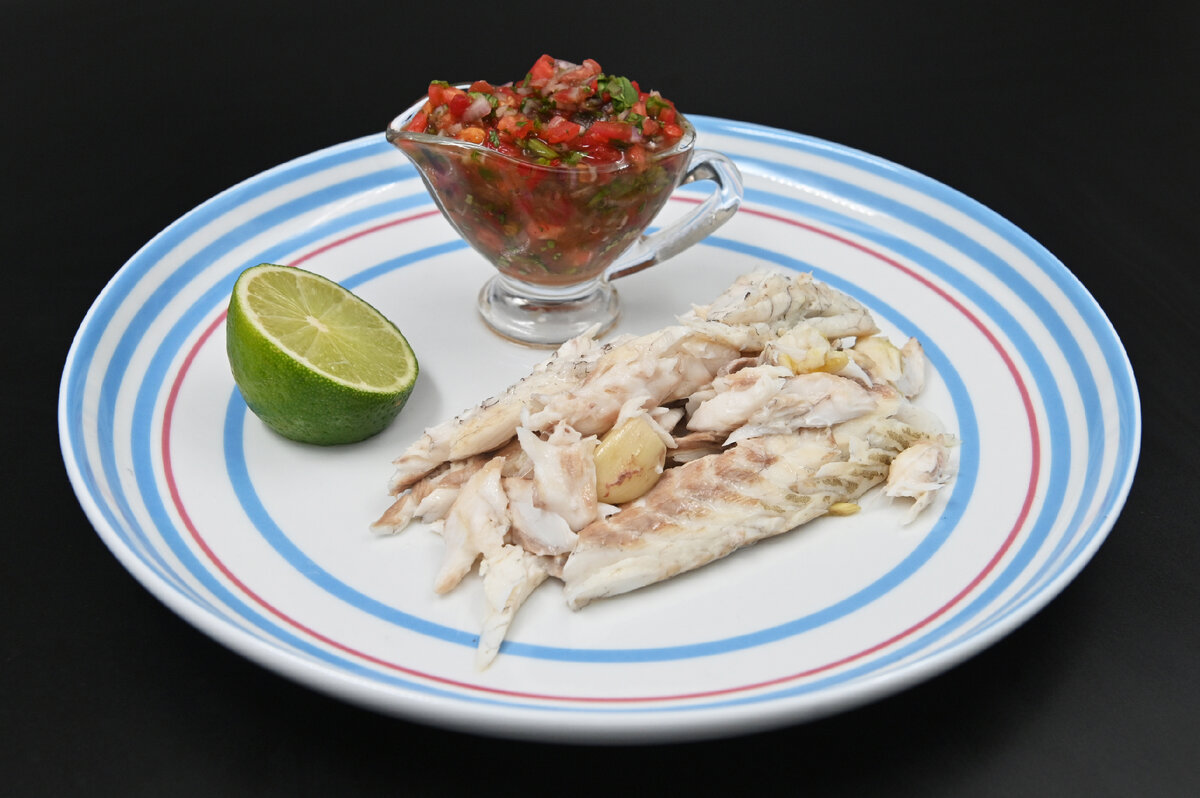 Промыть сибаса, очистить от чешуи, удалить плавники и выпотрошить.Смешайте яичные белки с лимонным соком и щепоткой соли, взбивая до пены.Натрите цедру лайма и апельсина, тщательно нашинкуйте лемонграсс. Добавьте эти ингредиенты в белковую массу с солью и перемешайте.Подготовьте противень: застелите пергаментной бумагой и выложите на него часть соли.Измельчите чеснок и положите его вместе с тимьяном в брюшко рыбы.Уложите сибаса на соль, затем полностью обваляйте его в оставшейся соли для сохранения сочности и аромата.Запекайте в разогретой до 180 градусов духовке в течение 25 минут.Перед подачей полейте рыбу водкой и осторожно подожгите.Подавайте с соусом пико-де-гайо.Приготовление соуса