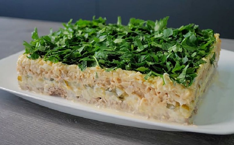 Каждый из ингредиентов следует нарезать мелким кубиком и заправить майонезом, чтобы достичь сочности и яркости каждого слоя.