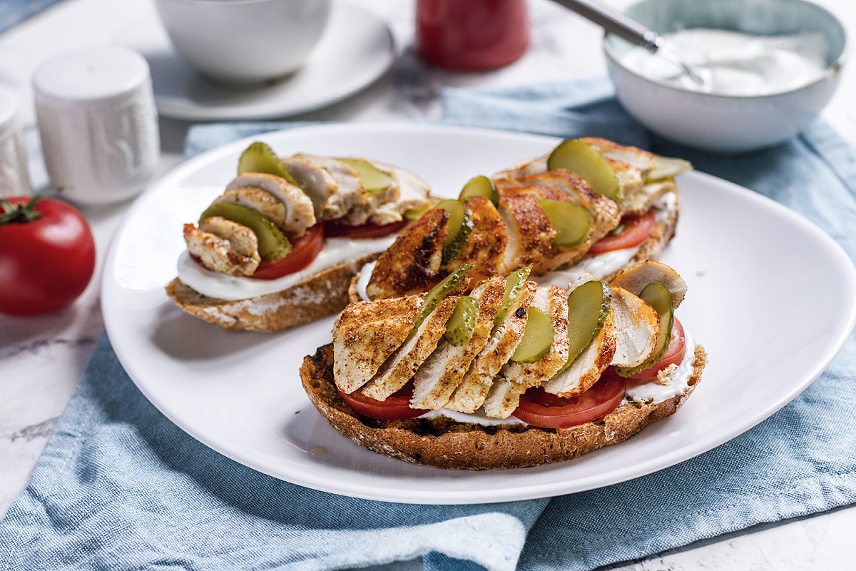 Очистите куриное филе, просушите его бумажными полотенцами.Обсыпьте мясо копченой паприкой, добавьте соль и перец по вкусу.На разогретой сковороде с 1 ст.л. растительного масла обжаривайте курицу: по 2-3 минуты с каждой стороны на сильном огне, затем на среднем огне еще 3-4 минуты.После жарки нарежьте мясо на тонкие ломтики.Помидоры и корнишоны нарежьте кружочками.Ломтики хлеба подсушите в тостере или на сухой сковороде по 30 секунд с каждой стороны.Для соуса смешайте йогурт с мелко нарезанной кинзой, добавьте щепотку соли и перца.Намажьте соус на хлеб, уложите слой помидоров, а затем чередуйте ломтики курицы и корнишонов.Подавайте тартин теплым, наслаждаясь неповторимым вкусом!Приятного аппетита!