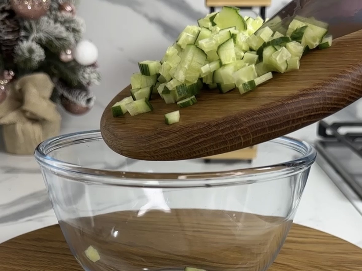 Первое, с чего начинается процесс, — это свежий огурец, который нужно нарезать мелкими кубиками. Он придаст начинке желаемую сочность и свежесть, так что выбирайте только свежий продукт.
