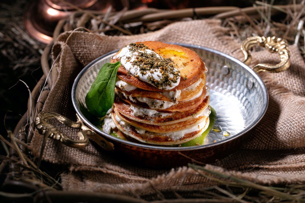 Шеф-повар Илья Черкашин из ресторана Levantine представляет новый взгляд на привычные блины. Эти пышные и толстые блинчики, созданные на основе нутовой муки, становятся не только основным блюдом, но и настоящим кулинарным шедевром. Их подают с баклажанами, запеченными в духе турецкой кухни — с добавлением йогурта, а завершающим штрихом служит ароматный заатар, который придаёт особую изюминку.