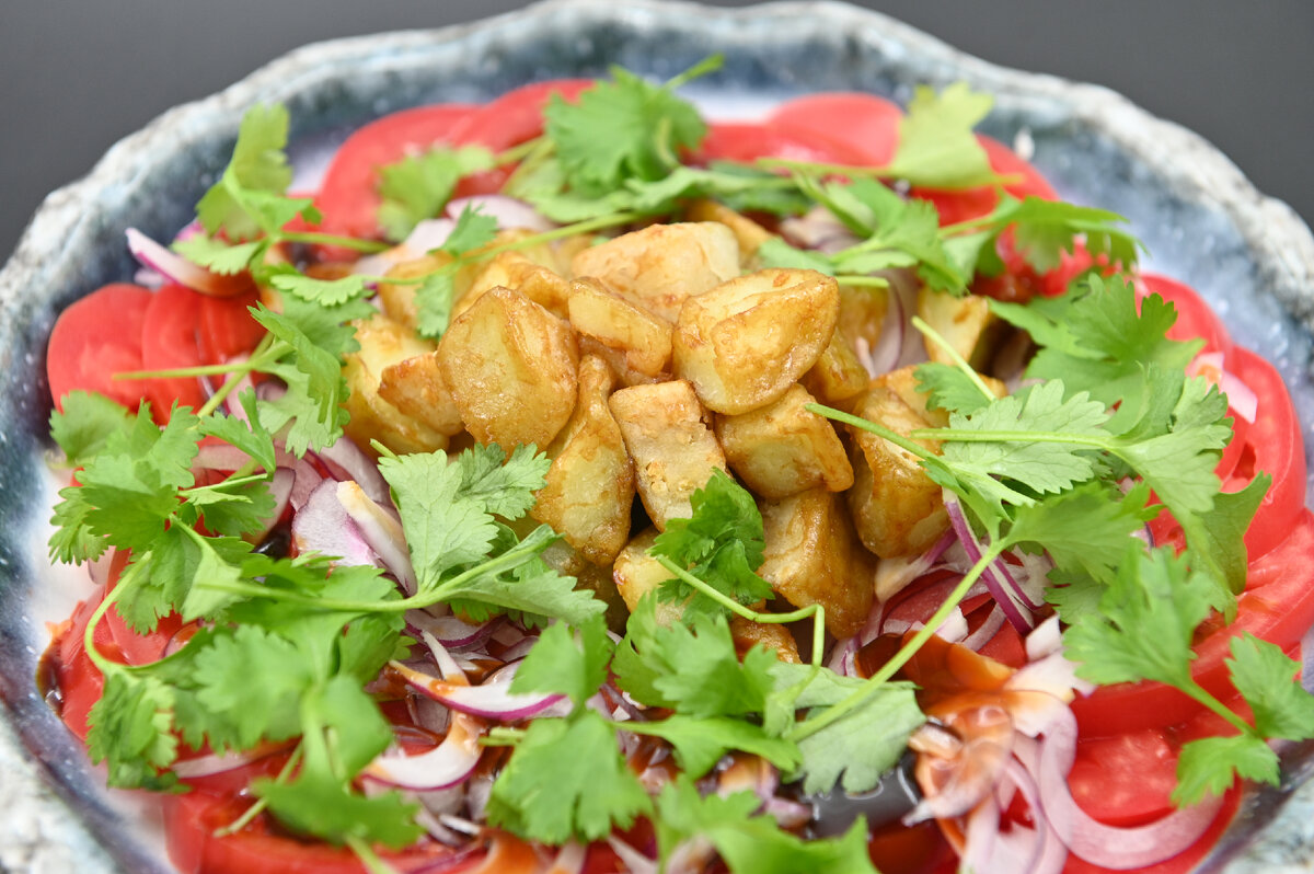 Очистите баклажаны от кожицы с использованием овощечистки и нарежьте их кубиками средней величины. Чтобы убрать горечь, замочите их в подсоленной воде на некоторое время.Далее нарежьте томаты дольками, а лук — полукольцами. Немного помните лук руками, чтобы он пустил сок, а кинзу нарвите.На тарелке разместите томатные дольки, а сверху добавьте лук, чтобы дать ему возможность замариновать помидоры своим соком в процессе обжаривания баклажанов.Баклажаны отожмите и обваляйте в крахмале. Затем обжарьте в разогретом растительном масле, позволив им немного отдохнуть, и снова поджарьте для образования хрустящей корочки.Готовые баклажаны положите на бумажное полотенце, чтобы убрать лишнее масло.В отдельной глубокой тарелке объедините баклажаны с небольшим количеством соуса терияки. Выложите их в центр тарелки, чтобы сохранить хрусткость.Украсьте блюдо свежими листочками кинзы и подавайте к столу!Шеф предлагает использовать метод с кинзой для проверки готовности масла: если вокруг листочка начнут образовываться пузырьки, значит, пора обжаривать. Приятного аппетита!