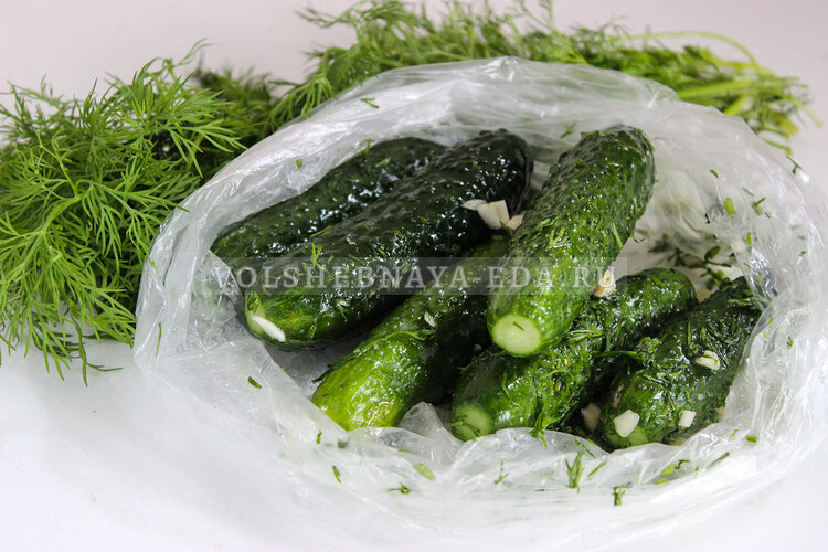 Как только все продукты готовы, следует тщательно промыть огурцы и отрезать концы. Затем их нужно поместить в пластиковый пакет. Далее добавляют соль, сахар, нарезанный чеснок и укроп.