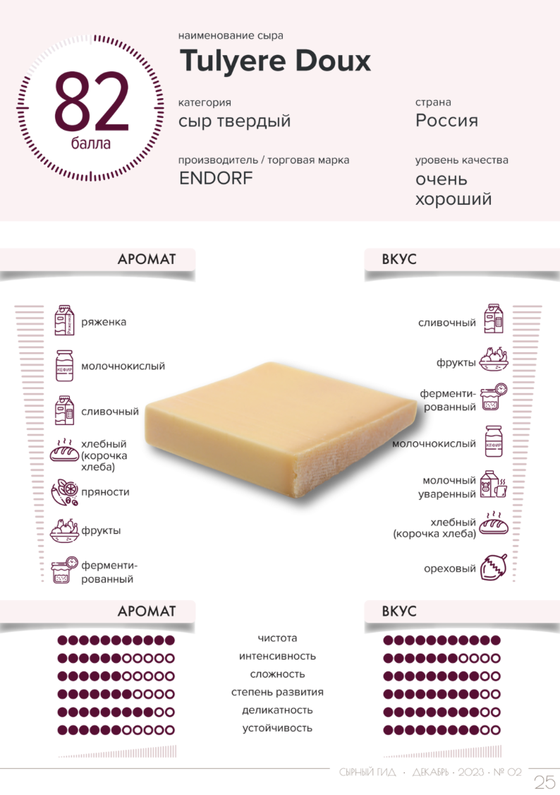 Этот сыр радует легким, но насыщенным ароматом, в котором можно уловить нотки ряженки, сливок и молочнокислых продуктов. Специи и ферментированные фрукты добавляют изюминку. Вкус Тulyere Doux более интенсивный, с хорошей сладковатостью и сбалансированной кислотностью. Он идеально подойдет как для сырной тарелки, так и для холодных закусок или брускетт.
