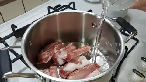Начинается всё с варки бульона. В кастрюлю помещаются жирные свиные рёбра, заливаются холодной водой и ставятся на средний огонь. Как только бульон закипел, необходимо убрать пену и добавить нарезанный лук и морковь. Затем щедро поперчить и посолить, уменьшить огонь и оставить вариться как минимум на 40 минут.