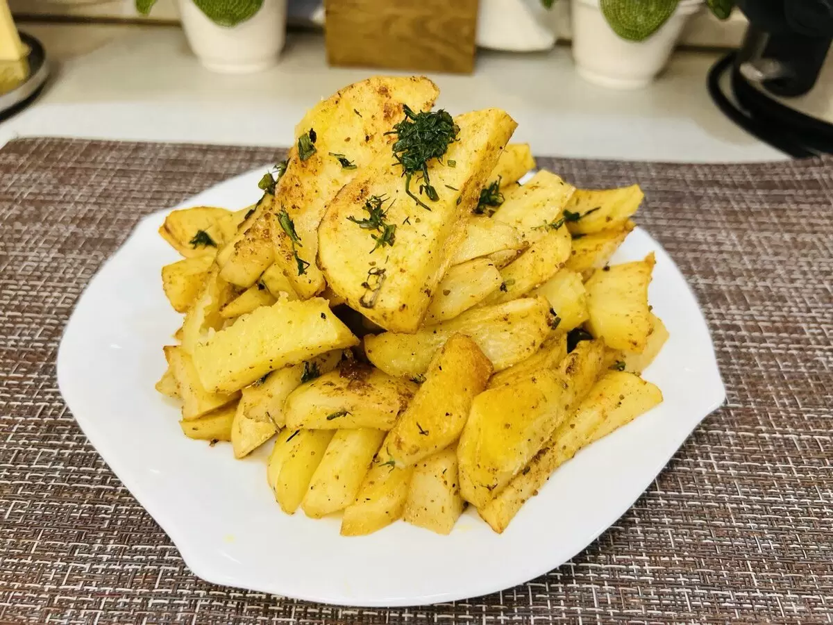 Когда картофель охватит аппетитный золотистый цвет, его можно вытащить из духовки. Дольки стоит посыпать свежей зеленью перед подачей на стол. Ароматное и аппетитное блюдо не оставит равнодушными даже самых притязательных гурманов!
