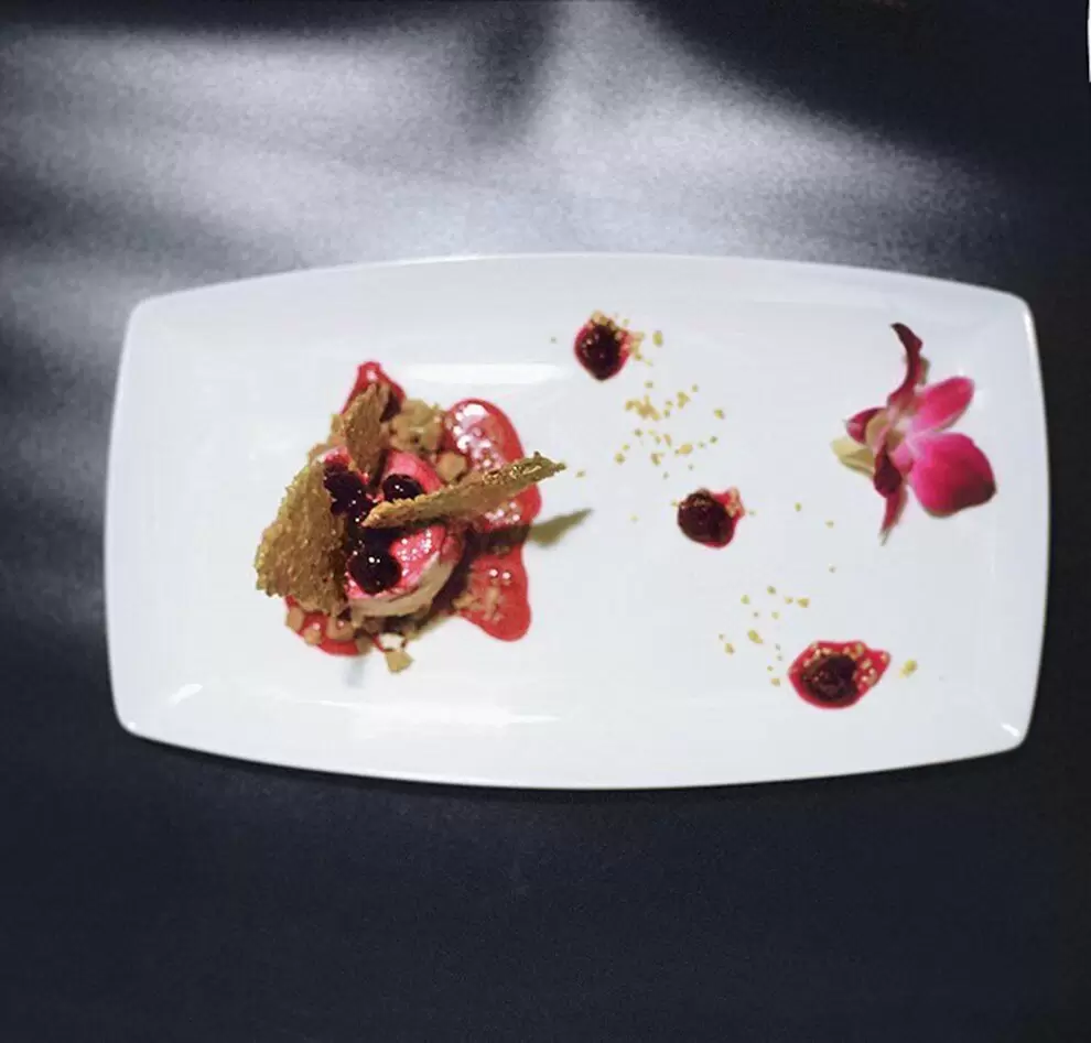 Сначала необходимо взбить сыр Филадельфия и маскарпоне с четырьмя яйцами и лимонами в мощном миксере до получения гладкой и густой консистенции.Полученная масса разливается по формочкам, которые затем помещаются на противень с горячей водой и выпекаются на водяной бане при температуре 170 градусов около 30 минут.Замороженную вишню обсыпают 125 граммами сахара и тушат на медленном огне.Когда смесь закипит, добавляют 10 грамм пектина и оставшиеся 125 грамм сахара, потом варят еще 7 минут. После этого следует остудить начинку.Для миндального кроканта смешать 75 г миндаля, муку, 50 г сливочного масла, тростниковый сахар и одно яйцо, затем замесить тесто. Его нужно раскатать и запечь в духовке без водяной бани при 170 градусах до золотистого цвета.Чтобы сделать миндальные чипсы, необходимо смешать глюкозу с оставшимся сливочным маслом, сахаром, пектином и 100 г миндаля, а затем выпекать при 180 градусах около 7 минут.Соберите десерт, перемешав сырную массу, крокант и вишни, затем украсьте цветком и сусальным золотом для изысканного эффекта.