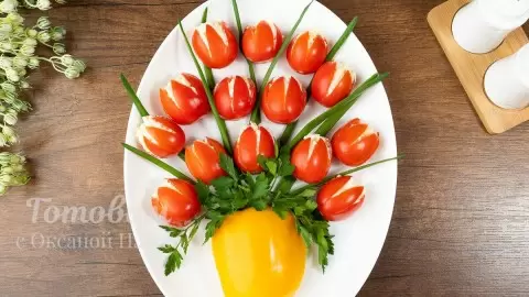 4. Наполняем каждую половинку начинкой, формируя из помидоров цветки.