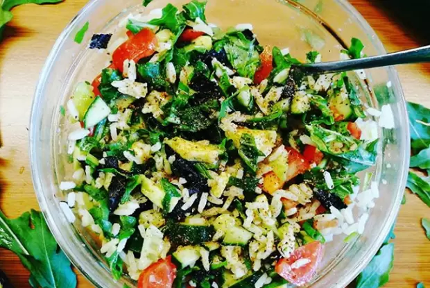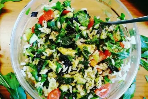 Рис тщательно промыть под холодной водой, затем отварить до полной готовности и остудить.Огурец, помидоры и авокадо нарезать ломтиками, не обращая внимания на форму — это придаст салату неформальный и аппетитный вид. Листья салата айсберг аккуратно порвать руками, чтобы сохранить их хрусткость.Листы нори нарезать на полоски, что добавит интересный вкус и текстуру.Все подготованные ингредиенты соберите в просторной салатнице. Приправьте их любимыми специями, добавьте растительное масло и соевый соус. Пonce экспериментировать с пропорциями, чтобы добиться идеального вкуса.Тщательно перемешайте все компоненты и подавайте на стол немедленно, чтобы насладиться свежестью и ароматом.Это идеальный вариант для легкого обеда или ужина, который не только насыщает, но и радует глаз своей необычной подачей. Настоящее наслаждение для ценителей восточной кухни!