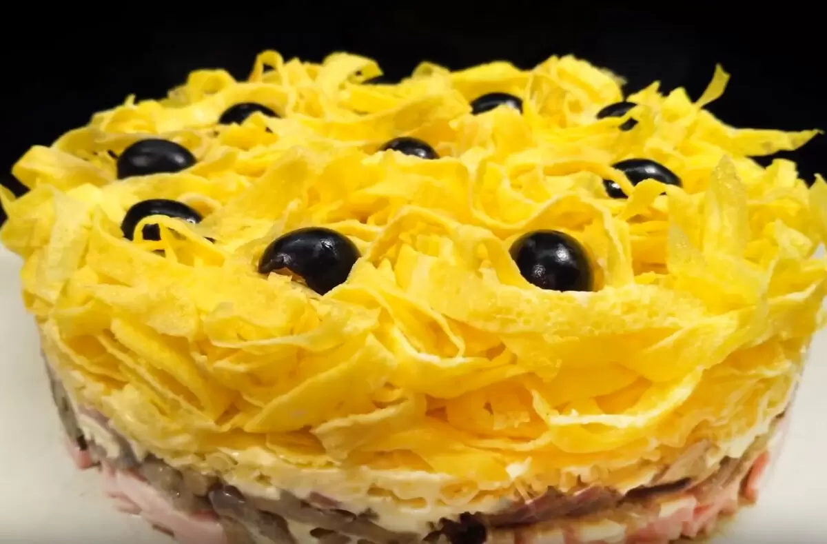 Салат выкладывается в кулинарное кольцо, начиная с первого слоя ветчины, нарезанной тонкой соломкой. Поверх ветчины делается майонезная сеточка, за ней следует слой маринованного лука, а затем – обжаренные грибы. Каждую прослойку можно дополнить майонезом и натертым сыром. Когда салат собран, на вершине располагаются нарезанные яичные блинчики.
