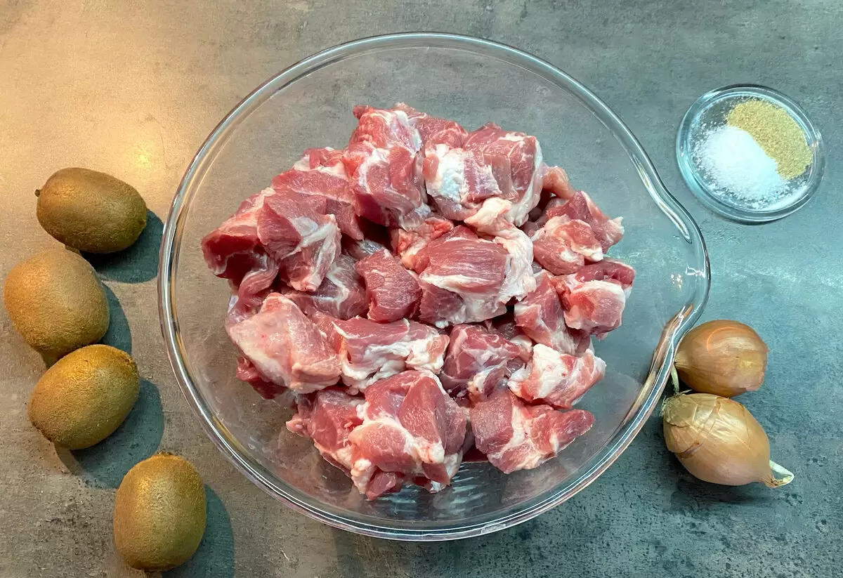 Первый шаг к созданию этого уникального шашлыка — подготовка маринада. Лук и киви смешиваются в блендере до получения однородной массы. Получившуюся массу добавляют к нарезанному мясу, щедро приправляют солью и перцем. Примерно через 4–5 часов в холодильнике (желательно дольше) мясо будет готово к жарке, впитав все ароматы маринада.