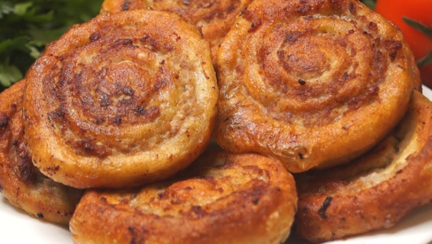Для начинки мелко нарезать лук и чеснок, добавить к мясу с солью и приправами, хорошо перемешать. Затем раскатать тесто в прямоугольный пласт, тонким слоем распределить начинку, свернуть в рулет и нарезать на кусочки.