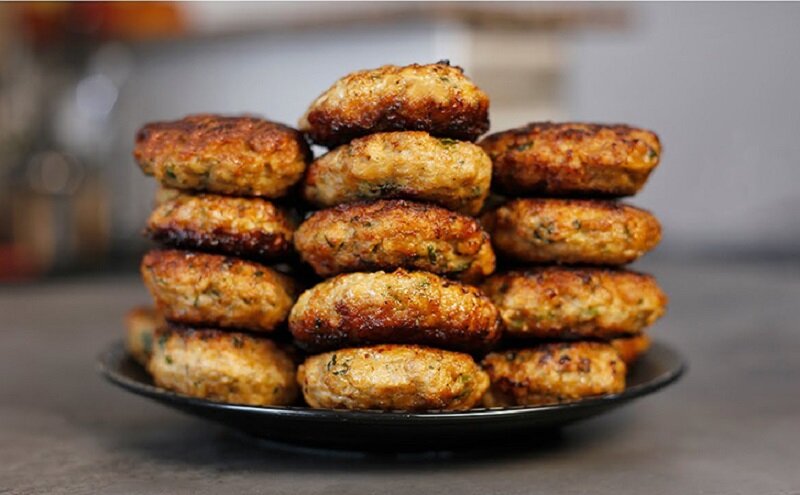Смешиваем куриный фарш с хлебом, добавляем оставшееся молоко, специи, крахмал и измельченную зелень. Затем тщательно вымешиваем массу и формируем небольшие котлеты. Можно обвалять их в панировке для хрустящей корочки.