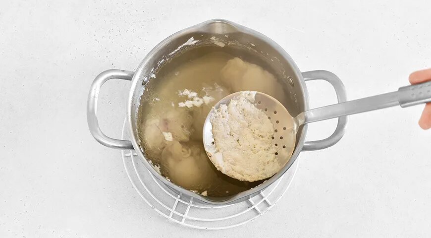 Для начала следует взять куриное мясо — это могут быть любые части: филе, бедро или голени. Промыв его, поместить в кастрюлю и залить 2,5 литрами воды. Довести до кипения, убрав пену, которая образуется на поверхности, затем уменьшить огонь и варить курицу около получаса.